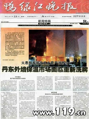 2011年5月24日,《鴨綠江晚報》發表題為《外保溫材料不合格 40家施工單位遭查封》;《丹東日報》發表題為《40家施工單位被查封》;丹東電視臺新聞頻道《第一傳媒》播出《外墻保溫材料‘告別’易燃》;丹東廣播電臺和丹東廣播電視報共同推出《消防重拳出擊建筑外保溫系統》系列報道。5月23日,丹東發行量最大的《鴨綠江晚報》新聞特稿版面利用一個整版,發表題為《火患頻發催生史上最嚴消防令——丹東外墻保溫市場面臨重新洗牌》的文章。